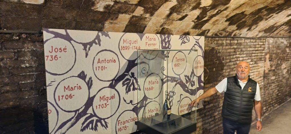 Entre las galerías subterráneas de Codorníu, un mural llama la atención de todos los visitantes: un enorme árbol genealógico pintado sobre los muros de ladrillo que narra más de 18 generaciones de la familia Raventós–Codorníu.